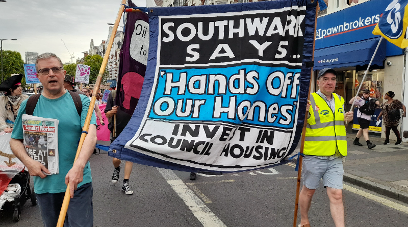 Pictured top: Campaigners marching with a banner that reads “Southwark says hands off our homes, invest in council housing” (Picture: Tanya Murat)