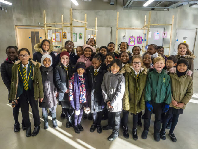 The first visitors to the exhibition were children from Harris Primary Academy Peckham Park, excited to see their own work on public display in the atrium of Mountview.