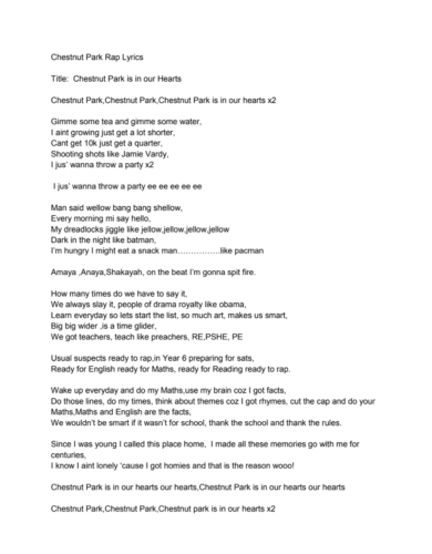 Its subtitle, Chestnut Park is in Our Hearts, gives a clue as to the content, a rap devoted to life at the school.