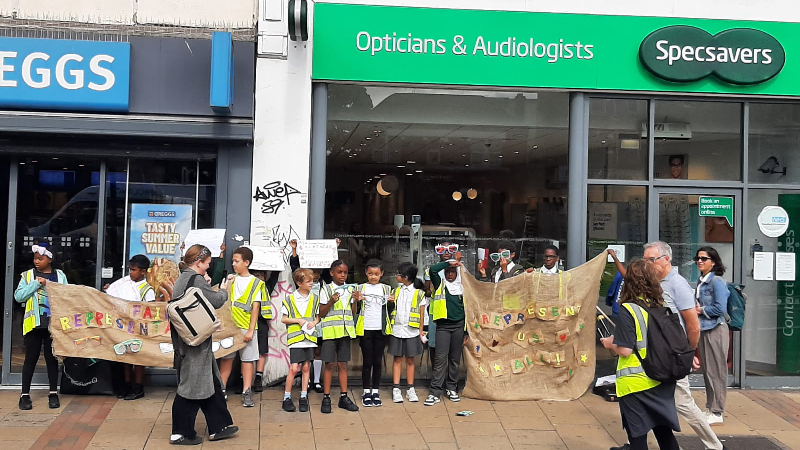Yesterday, students from Rathfern Primary School in Rathfern Road, Catford visited Specsavers stores across Lewisham to raise public awareness around the importance of representation and to celebrate the successes of their campaign so far.