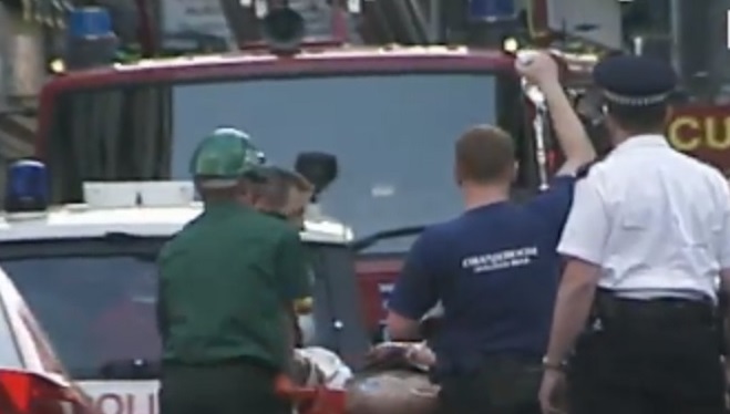 Still taken from a video recorded by TV news crews of paramedics helping the injured on that fateful day (Picture: ITN)