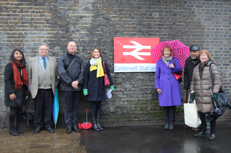 Helen Hayes, MP for Dulwich and West Norwood, fourth from left, and Harriet Harman, MP for Camberwell and Peckham, third from right, with members of the SE5 Forum for Camberwell supporting the earlier campaign for the reopening of Camberwell railway station