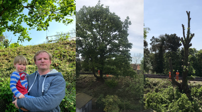 Pictured top: Matthew Shipp, 41, with his son Jacob, 2, in front of the oak tree in their garden in Hayes and a before and after photo of the oak tree at the end of Matthew Shipp’s garden (Picture: Joe Coughlan, Matthew Shipp)