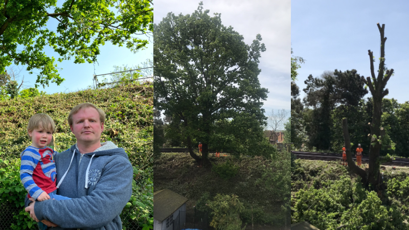 Pictured top: Matthew Shipp, 41, with his son Jacob, 2, in front of the oak tree in their garden in Hayes and a before and after photo of the oak tree at the end of Matthew Shipp’s garden (Picture: Joe Coughlan, Matthew Shipp)