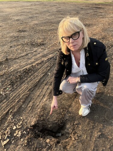 Councillor Donna Harris points to damage in Brockwell Park, Herne Hill, in June 2024 (Picture: Lambeth Liberal Democrats)