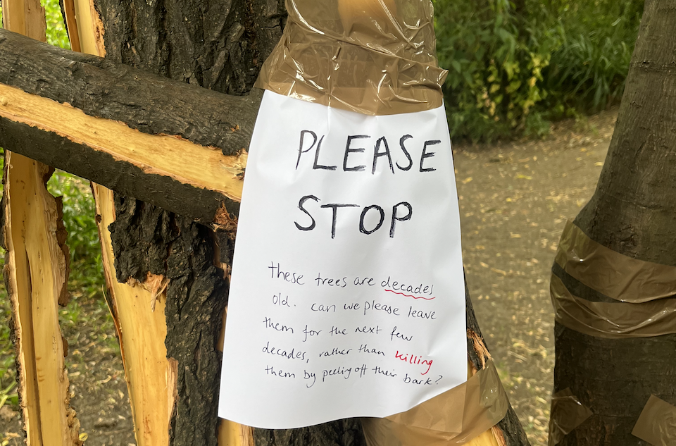 Residents said they were horrified after finding trees in their nearby park stripped and damaged with what appears to be a “sharp implement”.