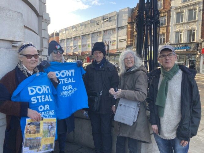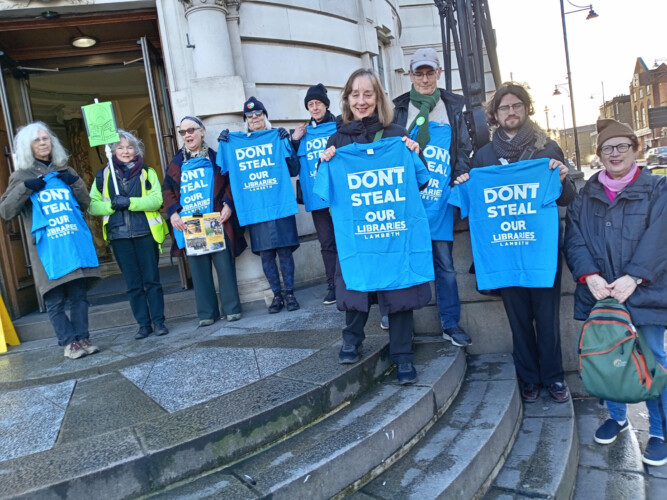 Lambeth UNISON and Friends of Lambeth Libraries took to the street outside Lambeth council’s building in Brixton Hill, holding T-shirts with printed messages reading “Don’t Steal Our Libraries, Lambeth”.