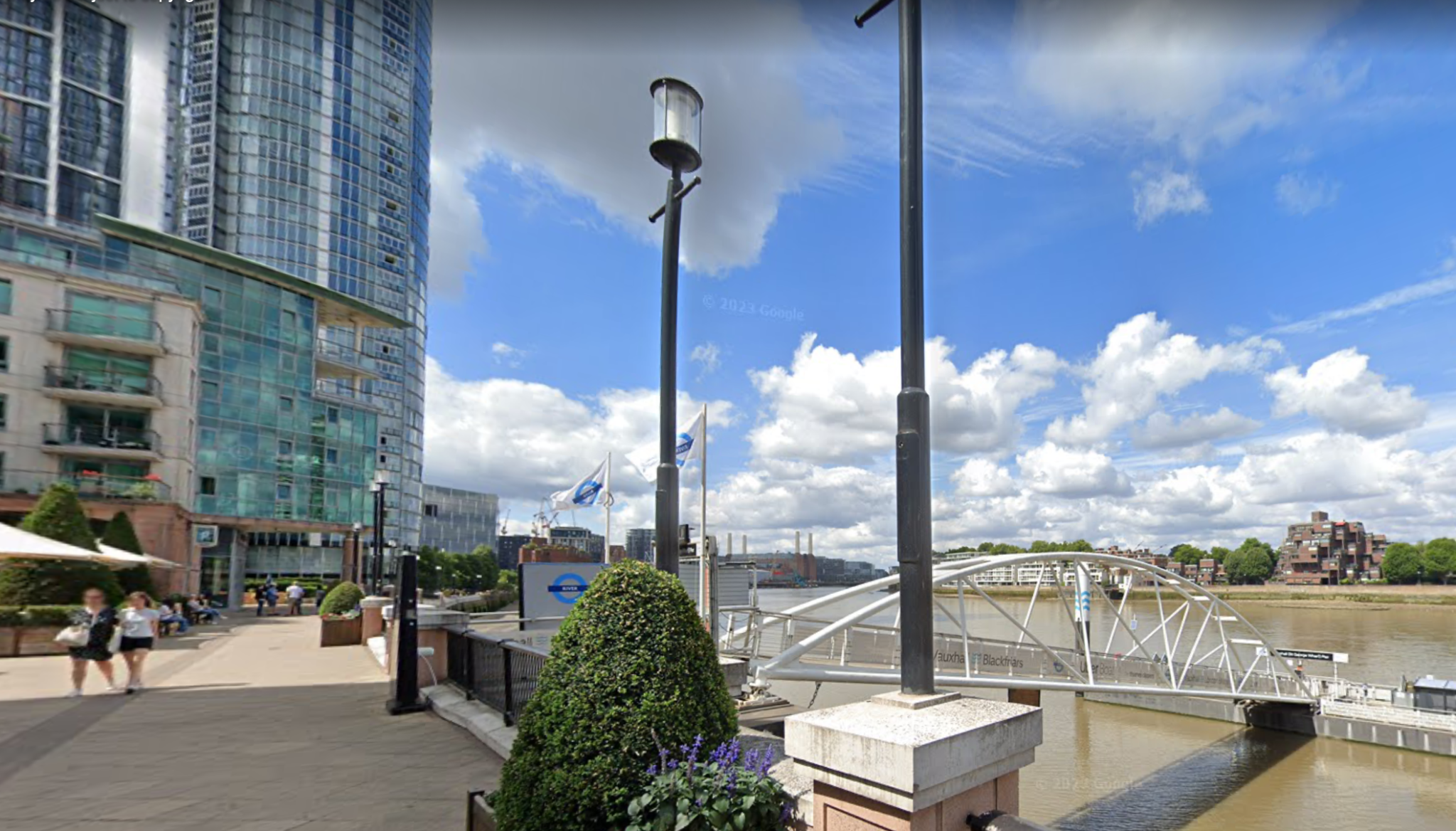 Pictured top: A member of the public spotted the body of a dog hanging by a tree below a pathway near St George Wharf Pier in Vauxhall on Tuesday morning (Picture: Google Street View)