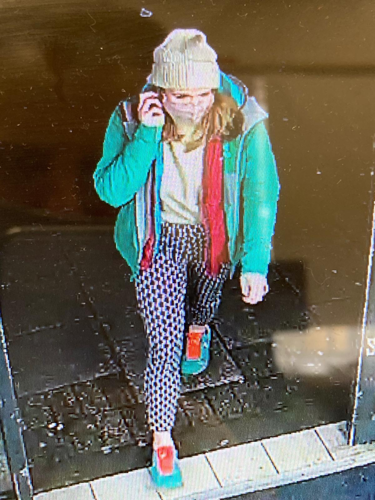 She was wearing a pale beanie hat, a short turquoise raincoat, leggings or jogging bottoms with a distinctive black and white chevron pattern, green running trainers with orange/fluorescent laces, with a red-coloured zipped Montane jumper/fleece under her jacket and a pale top under that.