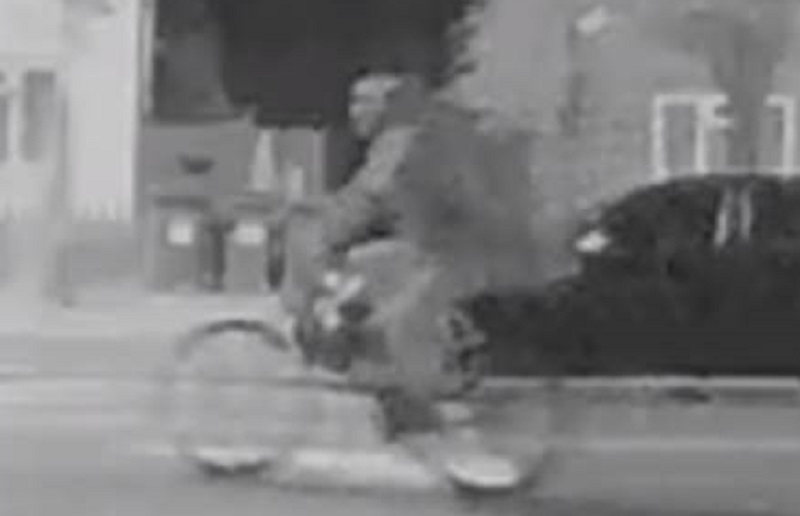 The image was taken by a CCTV camera in the Greenwich area on Saturday, 2 June. It shows that the man is carrying an over-sized bag, possibly a rucksack, as he rides along.