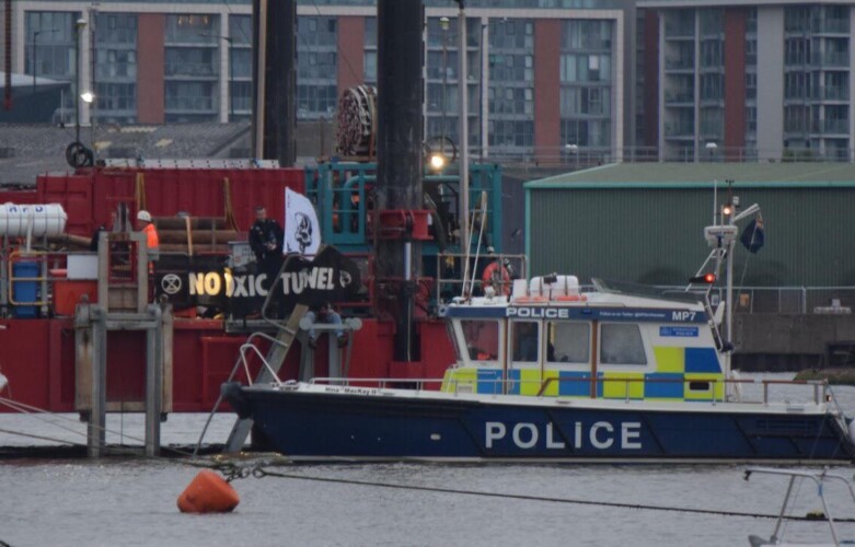 In a step change in direct action, three protesters boarded a Thames drilling rig early on Saturday morning, and unfurled a banner reading “No toxic tunnel”.