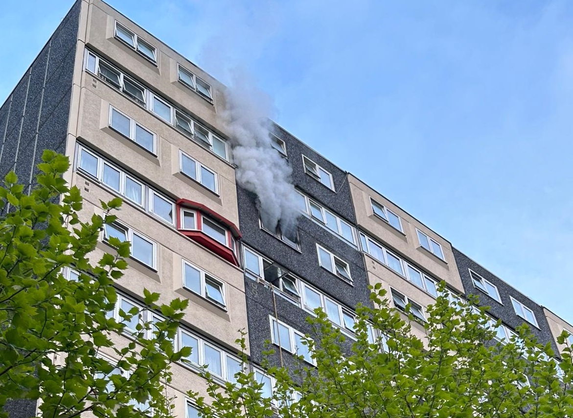Part of a split-level maisonette flat on the ninth and 10th floors of the block in Strasburg Road was damaged by fire. Three people left the flat before firefighters arrived, and there were no reports of any injuries.