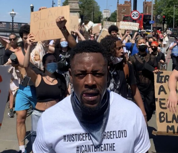 On Sunday May 31st, he led a peaceful Black lives Matter protest which began at the House of Commons in Westminster and marched to the US Embassy.