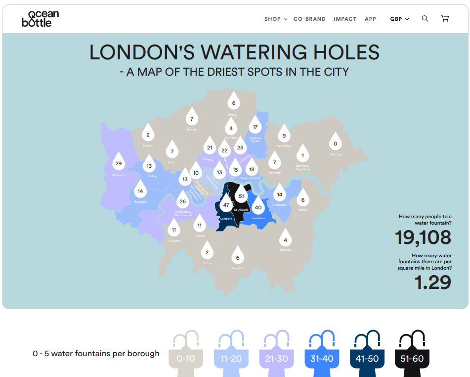 The statistics, gained through Freedom of Information requests, say the highest numbers of fountains were found in Southwark (53), Lambeth (51) and Lewisham (43), with only one in Barking and Dagenham and none in Havering.