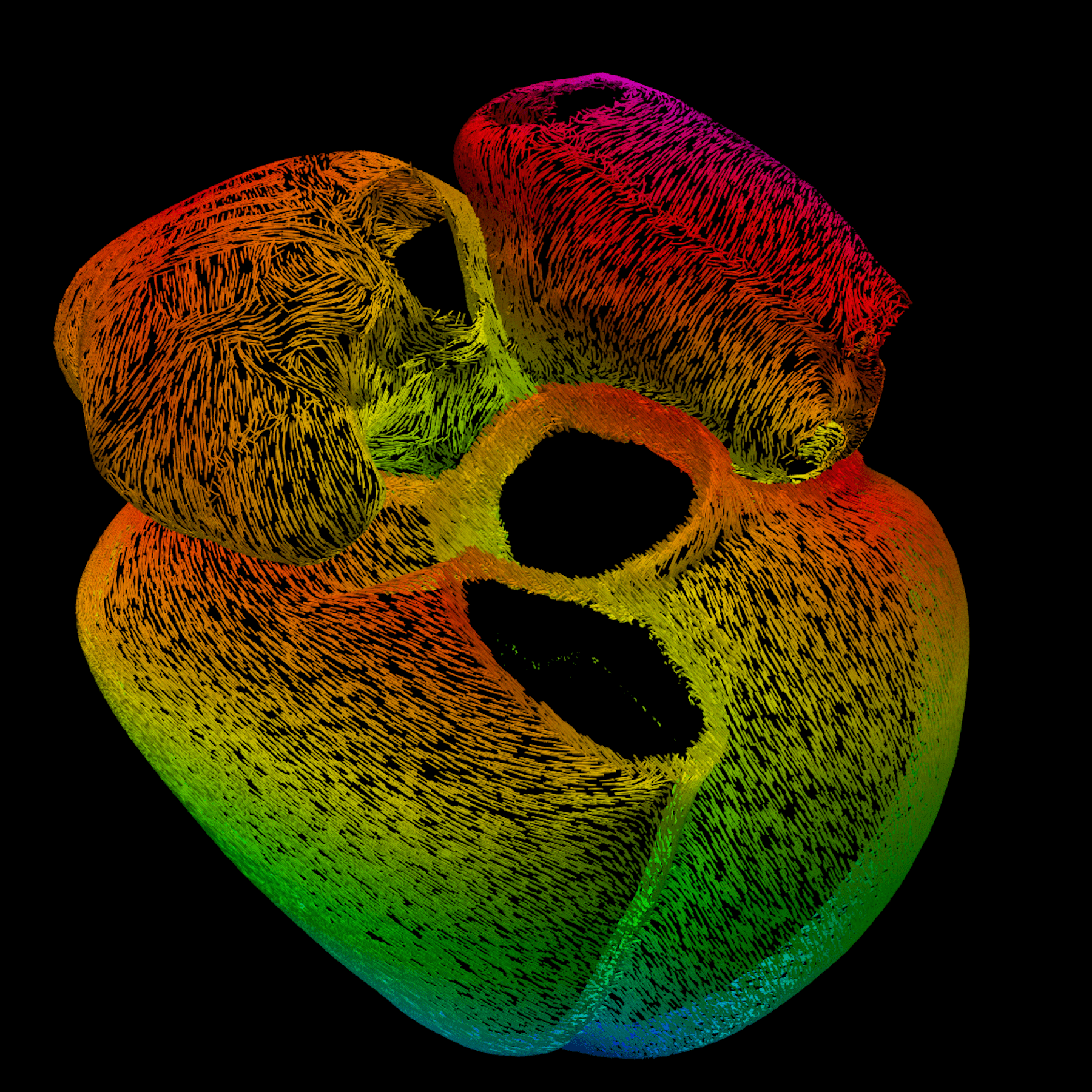 “By simulating how electrical activity spreads through the heart, following the direction shown in the picture, to then trigger a heartbeat, we can predict how specific patients will respond to treatments to personalise and adjust how we care for them.”