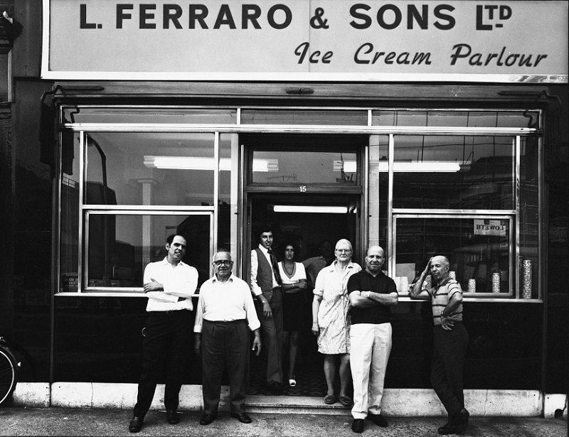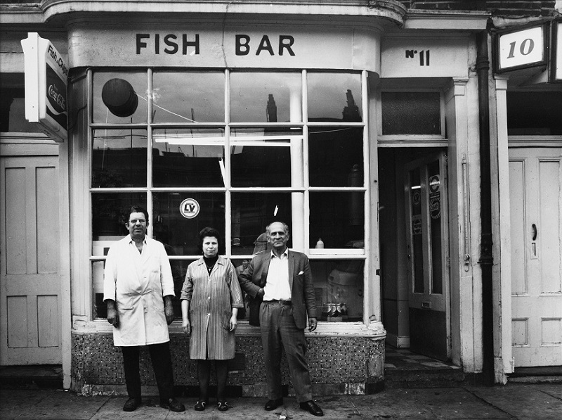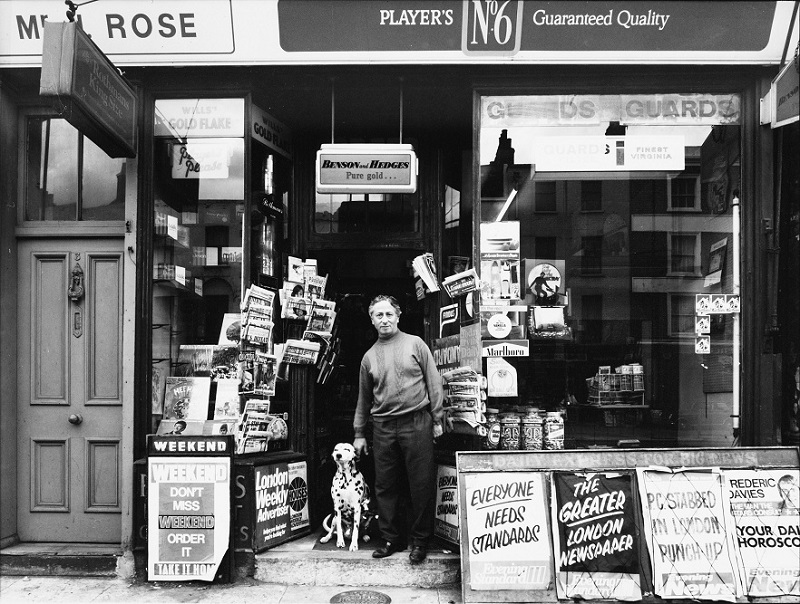 In 1975, Elephant and Castle’s London Road had a range of independent businesses and homes: pubs, bookshops, a cash and carry, an ice cream parlour, cafes, ironmongers and newsagents, depicted in the exhibition’s images.