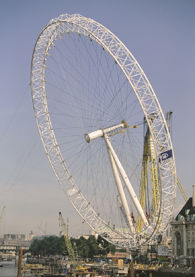 The wheel was constructed in sections, floated up the Thames on barges and assembled lying flat on piled platforms in the river.