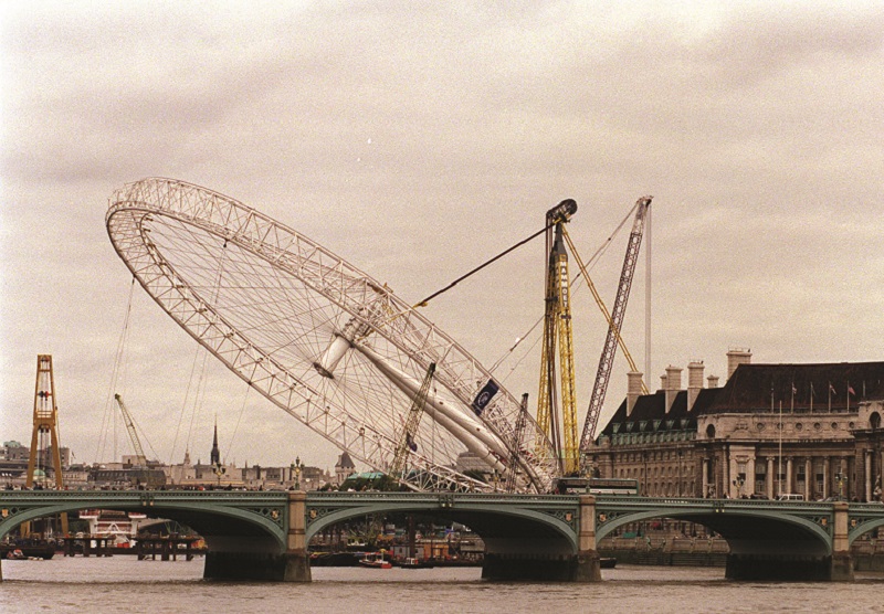 It became the largest object that had ever been lifted from the horizontal to the vertical on October 13, 1999. But a cable came loose at the official opening. Virgin owner Richard Branson flew a balloon overhead that said “BA can’t get it up.”