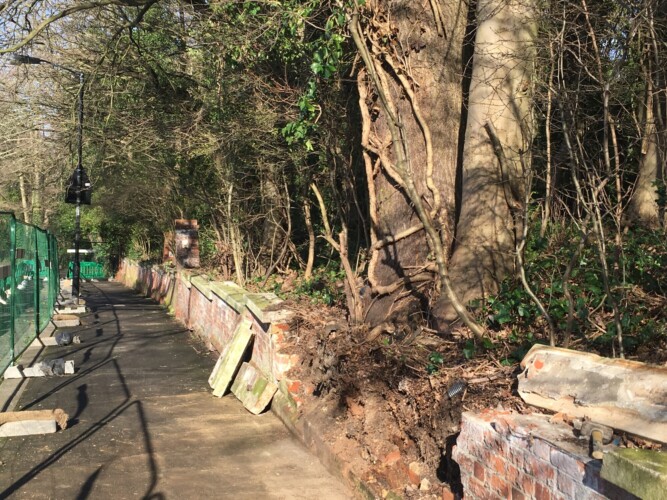 “However, tree roots were found extending beneath the wall and this, coupled with the clearance area required for safe reconstruction, meant that 34 trees would have to be felled.”