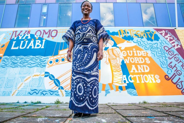 Muralist Polly Alakija was commissioned to work with Southwark school children, residents and community groups as well as a group of Nigerian-British artists to create the mural.