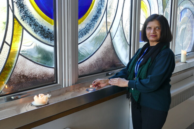 Pictured: Neeta Vadgama from St Christophers Candle Child Bereavement Service lights a candle of remembrance at the hospice