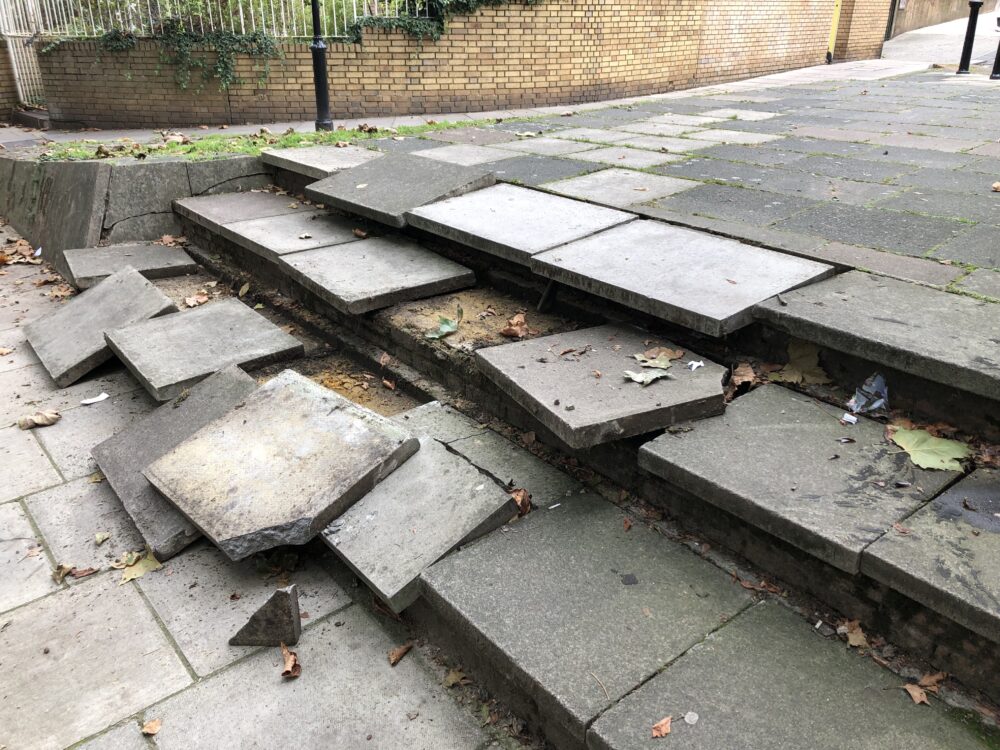 A hunt is underway to catch a driver who drove down a concrete staircase and smashed it to bits in one of London’s poshest areas.