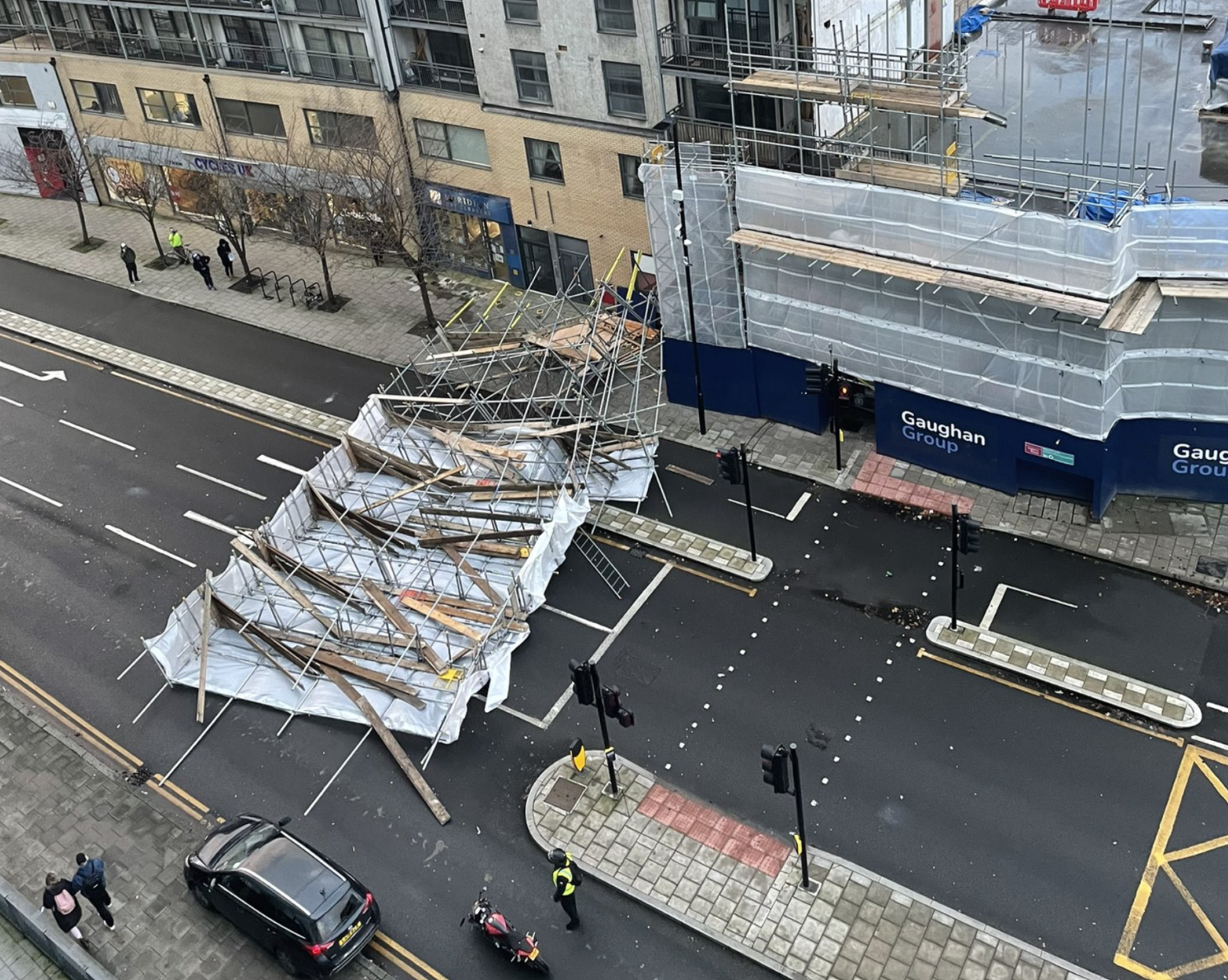 Scaffolding collapsed into a road in Greenwich as Storm Henk ripped through the capital yesterday afternoon.