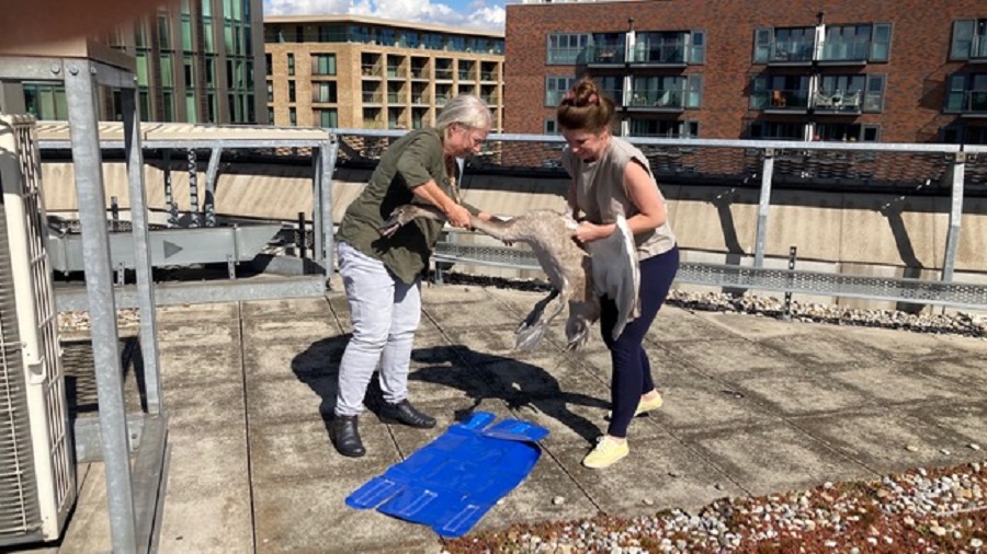 Stranded cygnet rescued from roof in Canada Water