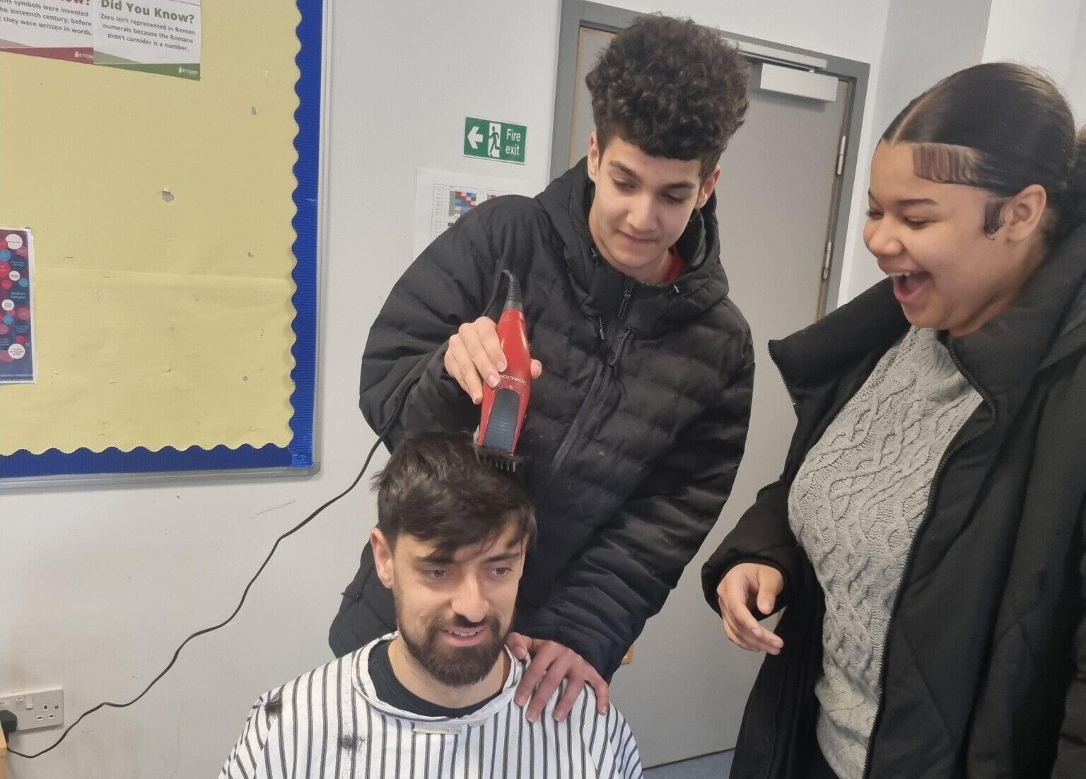 Students at a specialist school enjoyed a hands-on experience of hair cutting after a teacher bravely put himself forward for a trim.