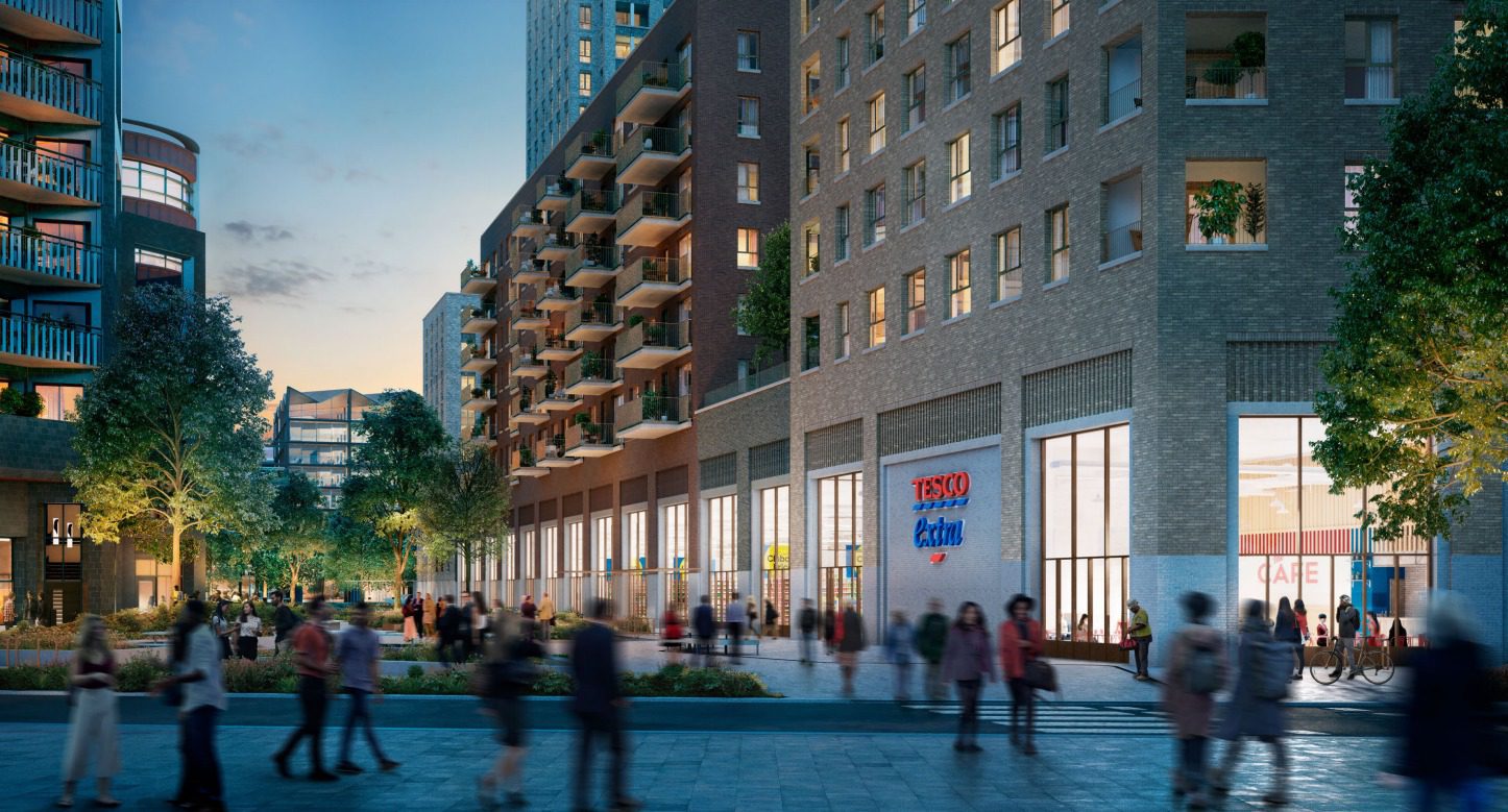 A new 12,500 square metre Tesco supermarket will be built underneath the proposed apartment blocks. It will replace the Tesco Extra in nearby Surrey Quays Shopping Centre, which is set to be demolished at a later stage.