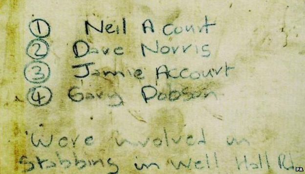 Note delivered to the police accusing Jamie Acourt of being involved in Stephen Lawrence murder