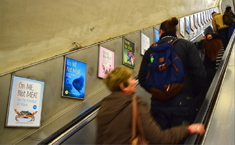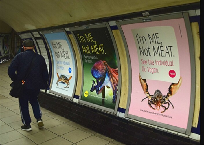 More than 50 posters featuring fish, crabs, lobsters and octopuses are now covering the crowded commuter stop, amid a PETA Tube takeover this month, which is World Vegan Month.
