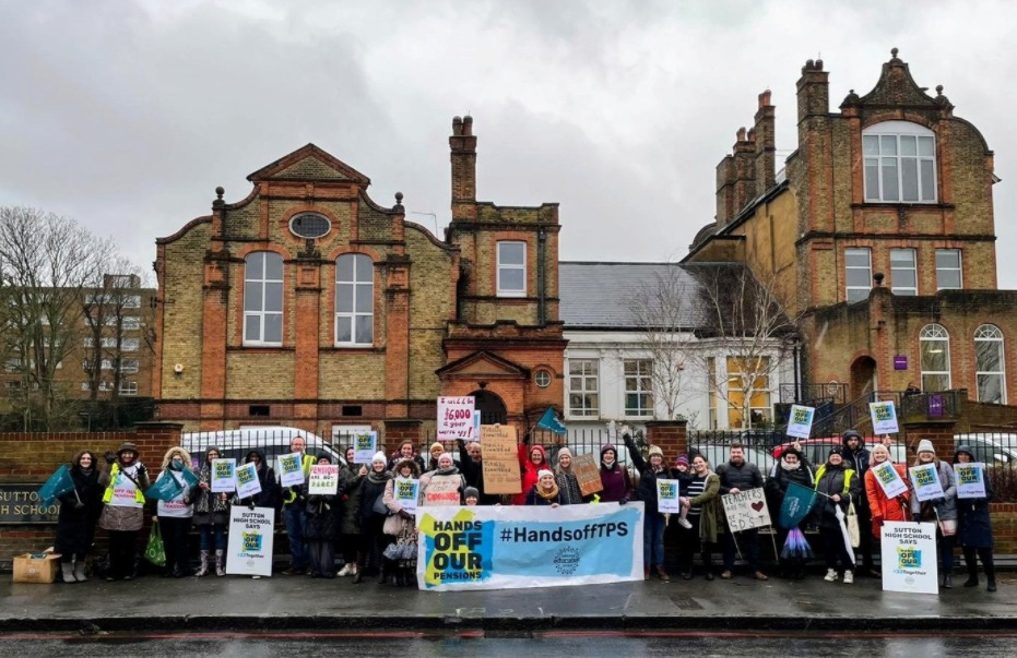 Pictured top: Sutton High School teachers on strike over changes to staff pensions (image: Sheldon Vestey)
