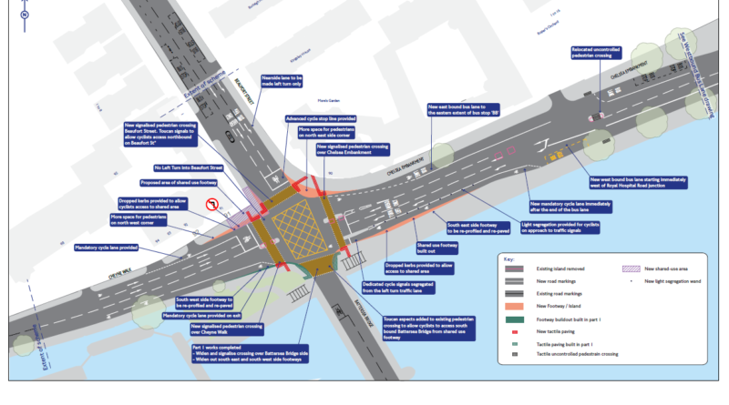 TfL’s newest phase will be adding in new push-button pedestrian crossings in Cheyne Walk, Chelsea Embankment and Beaufort Street, at the north end of the bridge.