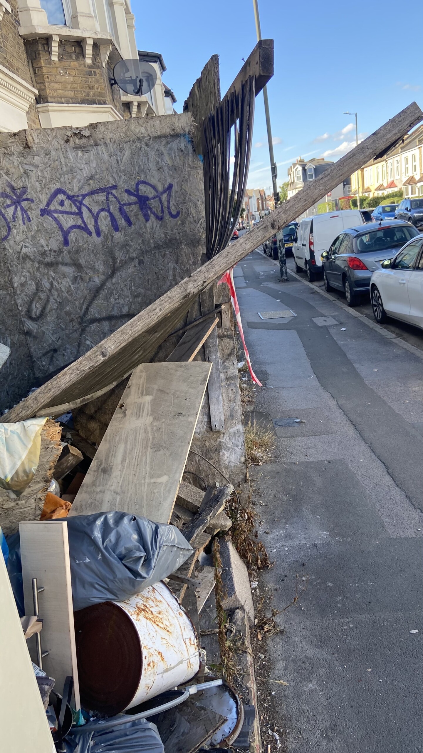 The house in Haydons Road, Wimbledon, has piles of rubbish left outside the front garden with debris regularly falling onto the pavement, decaying timber with exposed nails at eye level, and is attracting vermin.