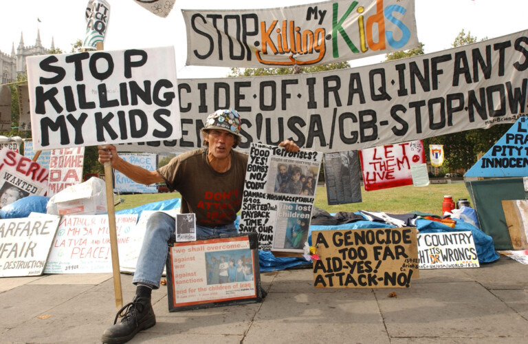 Brian Haw began a peace protest against the war in Iraq and UK and US foreign policy, on the grass at Parliament Square in Westminster in June 2001.