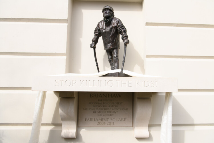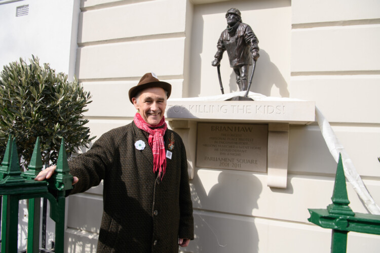 Mr Haw will be remembered by a small statue in Lambeth Road, opposite the Imperial War Museum. The location marks the edge of the exclusion zone created by authorities in 2005 in an attempt to move Mr Haw’s protest from outside Parliament.