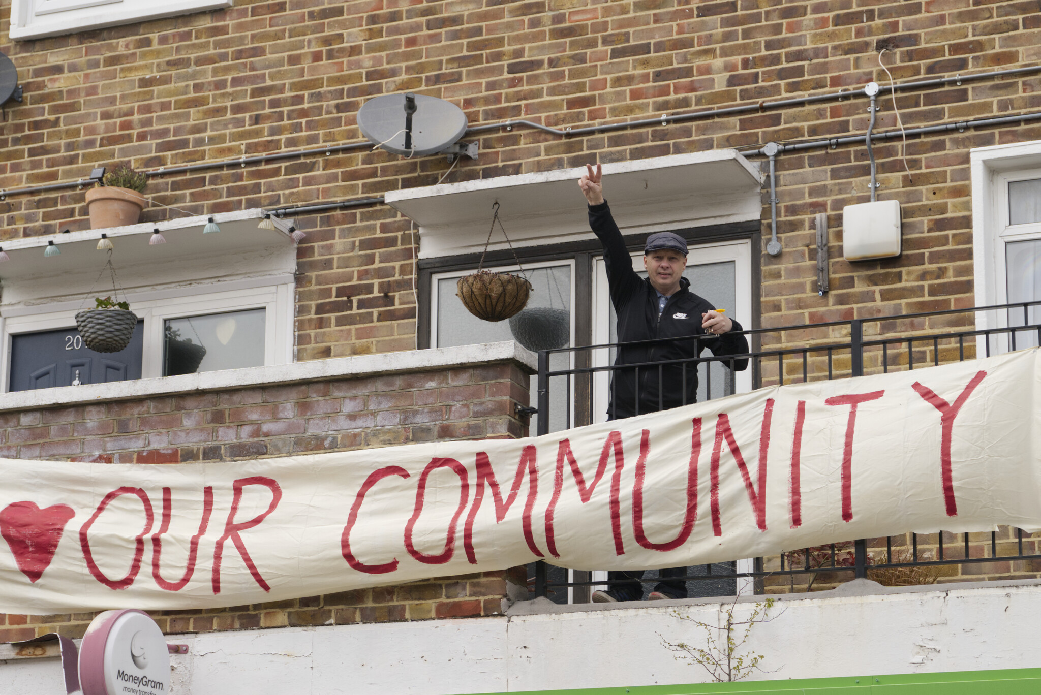 Pictured top: Tony McDermott outside his flat in Amesbury Avenue, with a banner reading “save our community” (Picture: Quentin Wright)