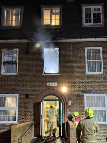 Most of the flat was damaged in the fire, which blew through an internal wall to the next bedroom, taking off the bedroom’s door. The window in the room where the fire started also blew out, the LFB said.
