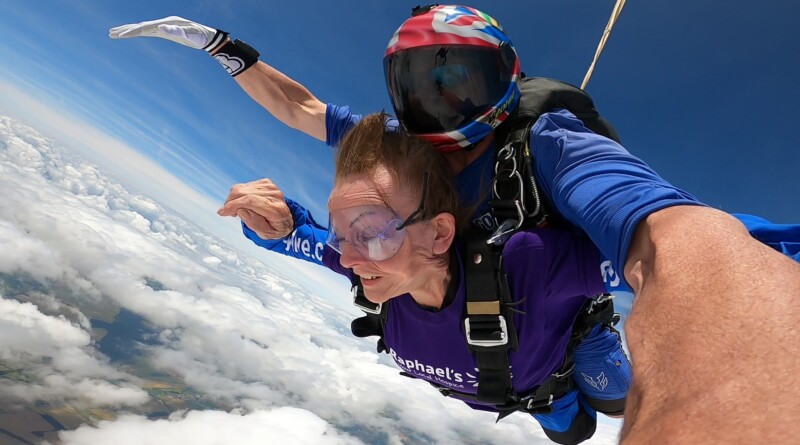 Auriel Glanville, from Florence Road in Wimbledon, bravely took to the skies on Thursday with the GoSkydive team at Old Sarum Airfield in Salisbury to raise vital funds for St Raphael’s Hospice, which has sites across Merton, for her late partner Richard Mackie who died of cancer.