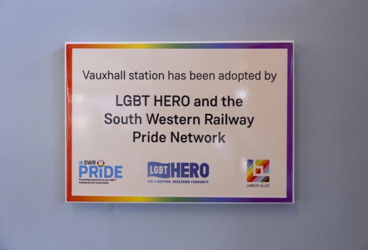 Yesterday morning, Member of Parliament for Vauxhall and Camberwell Green, Florence Eshalomi, South Western Railway (SWR) Managing Director, Stuart Meek, and LGBT HERO’s Chair, Alan Palmer, unveiled a commemorative plaque by LGBTQ+ artists from the area at the station’s waiting room, where they also cut a rainbow ribbon.