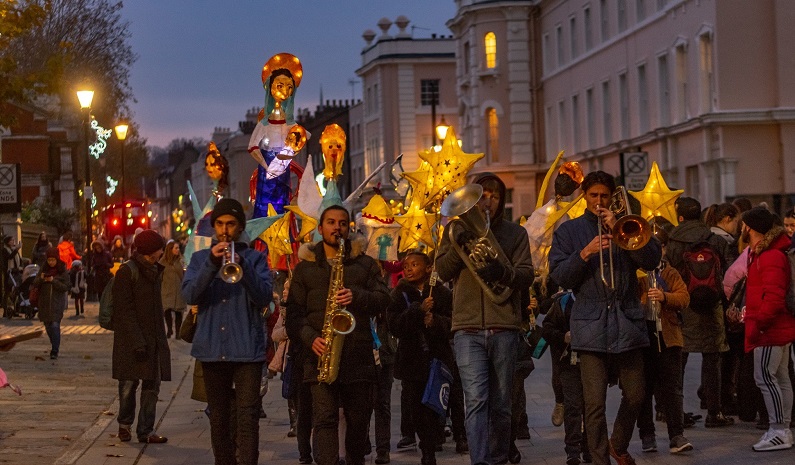 A giant Mary with baby Jesus, the angel Gabriel surrounded by a host of angels, shepherds with a flock of sheep, a donkey, a moon and stars and little Bethlehem houses all followed the star of Bethlehem through the Old Royal Naval College grounds and Cutty Sark Gardens, into the market.