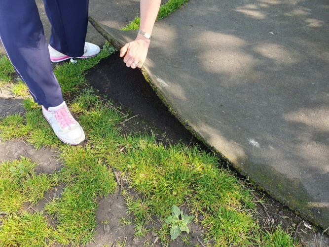 Ms Wallop points to poor flooring in Ravenscourt Park (Picture: LDRS)