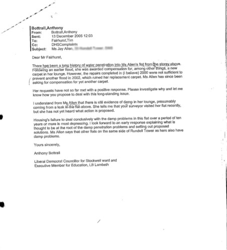 A year later in 2005, former Liberal Democrat cllr for Stockwell Anthony Bottrall, wrote to the council regarding the condition of Ms Allen’s flat.