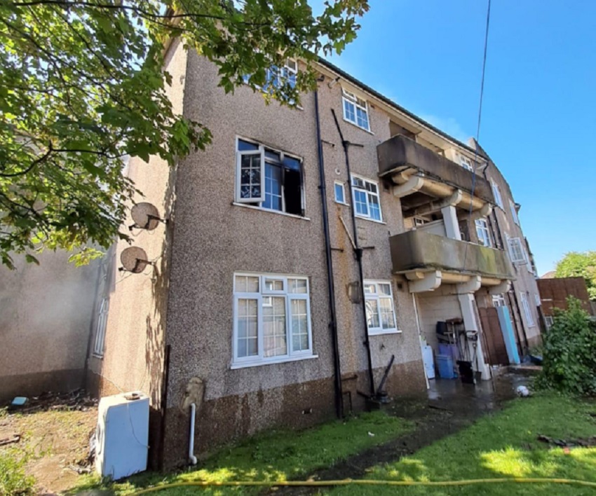 Pictured top: The exterior of the housing block, where the fire took hold (Picture: LFB)