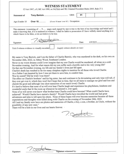 In a witness statement released by the Met, Charlie’s father, Toby Bartolo, said: “Never in my worst dreams did I ever image that my son Charlie would be murdered, all alone.