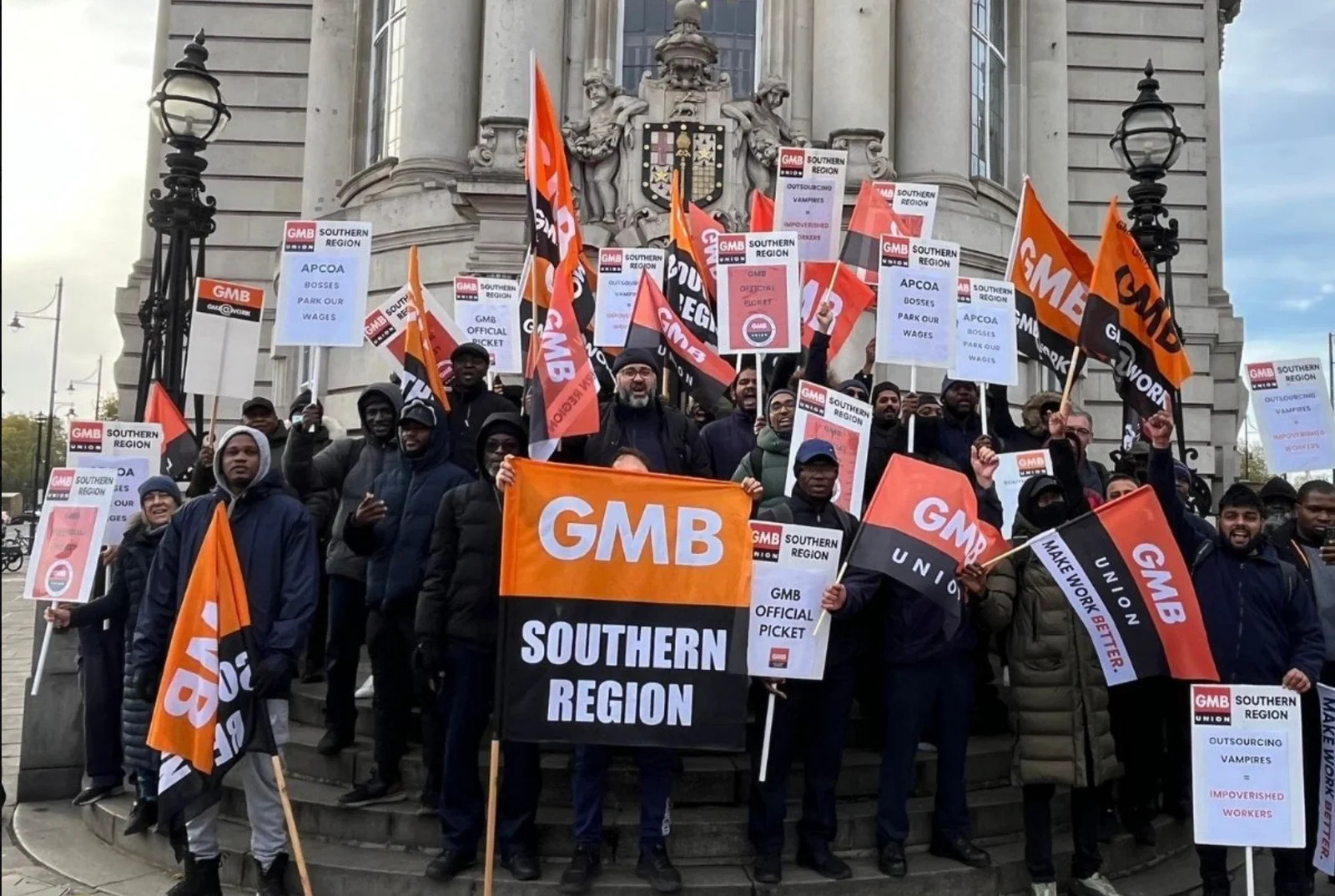 Pictured top: Parking wardens and members of GMB union outside Lambeth council in October (Picture: GMB)