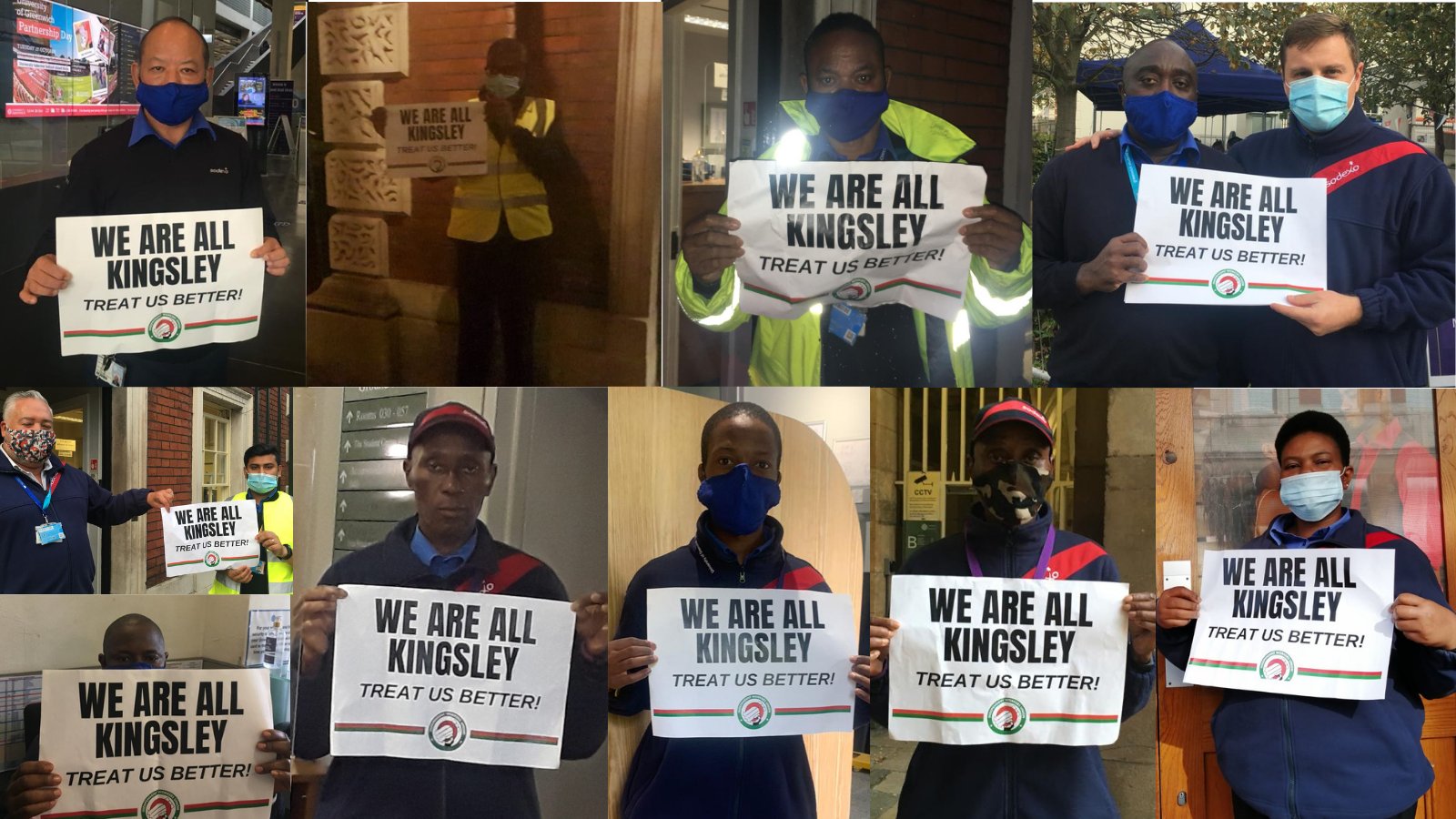 IWGB said after staff spoke out on social media about the allegation against Kingsley – using the hashtag #WeAreAllKingsley – Sodexo insisted all security officers sign a conduct and social media policy, which includes restrictions on their abilities to speak publicly about issues at work.