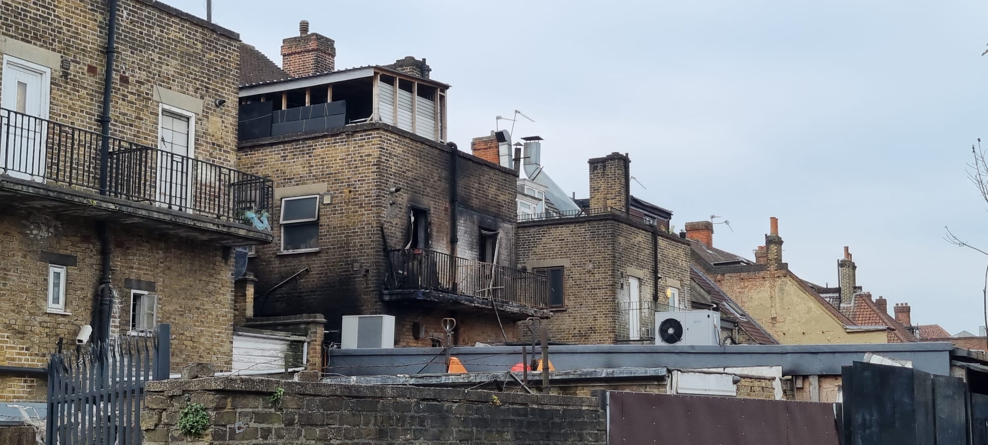 Pictured top: Damage to flats in Randlesdown Road, Bellingham (Picture: Tyrone Raven)