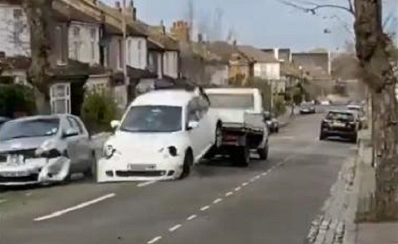 The video that surfaced online this week shows a white tow truck dragging a white Volkswagen Beetle, which was not attached to its hook properly, down the road and damaging four parked cars in the process.